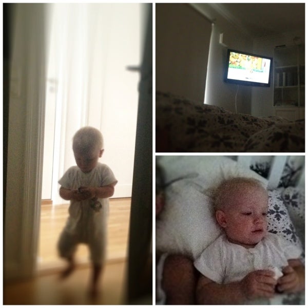 06.00 Leker lite på sitt rum men tröttnar utan sällskap och knatar in till oss och vill se på tv. Mer snoozingtid 🙂 (höll i sig ca 10 minuter)