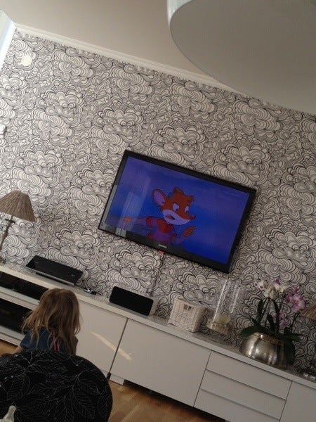 14.00 hittar grymt snygg lampa på HULDAs. Kan inte bestämma oss för vit eller svart så det blev en tavla istället. Sålänge…
