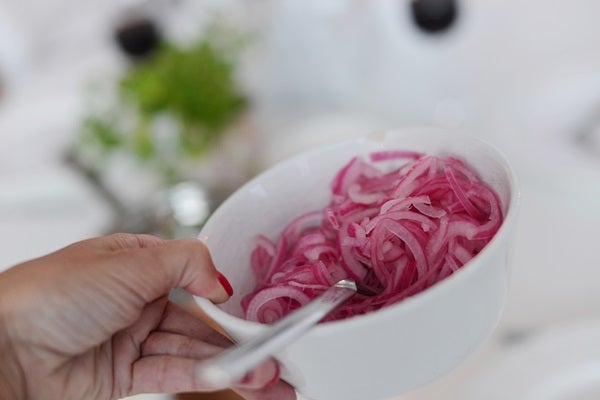 Picklad rödlök: Strimla rödlökarna fint och blanda med resten av ingredienserna. Låt stå och dra i minst 15 minuter innan servering.