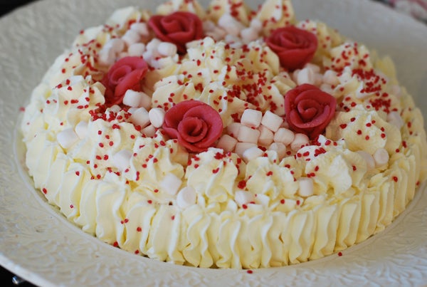 På barnkalaset bjöds det på gräddtårta med marshmallows, marsipanrosor och jordgubbsströssel (och 5 små ljus och tomtebloss), fylld med grädde, mandarinklyftor och blåbär.
