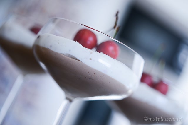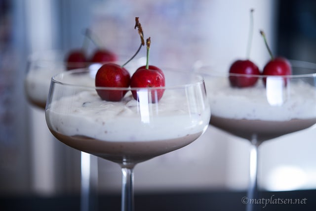 (Tips. Vill man kan man skippa körsbärssylten och ha den vita moussen naturell, servera gärna med en klick syrlig passionsfrukt ovanpå istället då!)