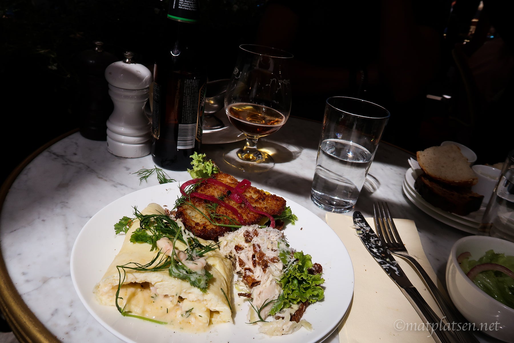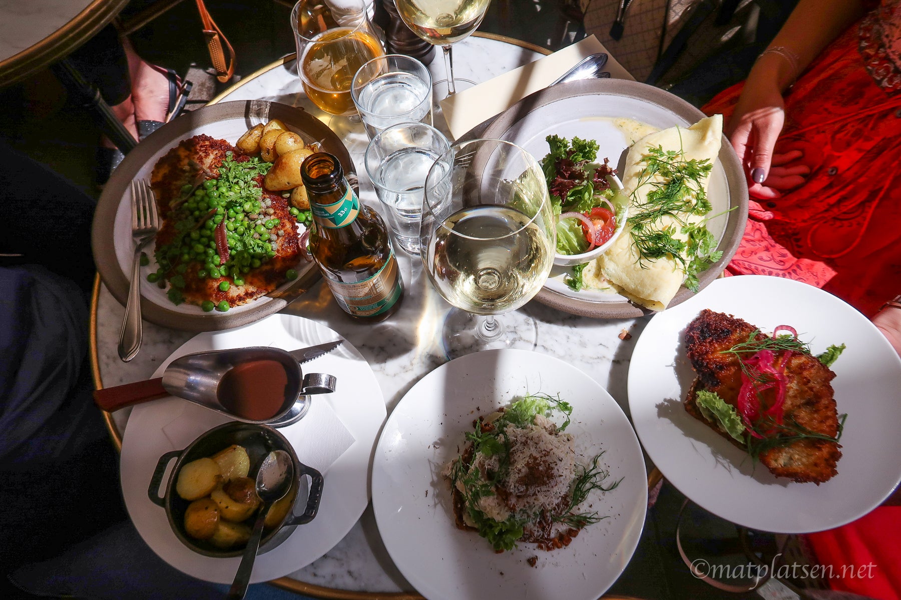 Lunch åt vi på Wienercaféts uteservering. Perfekt strosa-på-stan-väder, lite svalare men varmt i solen och nästan kyligt i skuggan. Perfekt som sagt. Schnitzlar, omelett med räkstuvning, smörrebröd med friterad rödspätta och kycklingröra med tryffel trängdes på bordet.