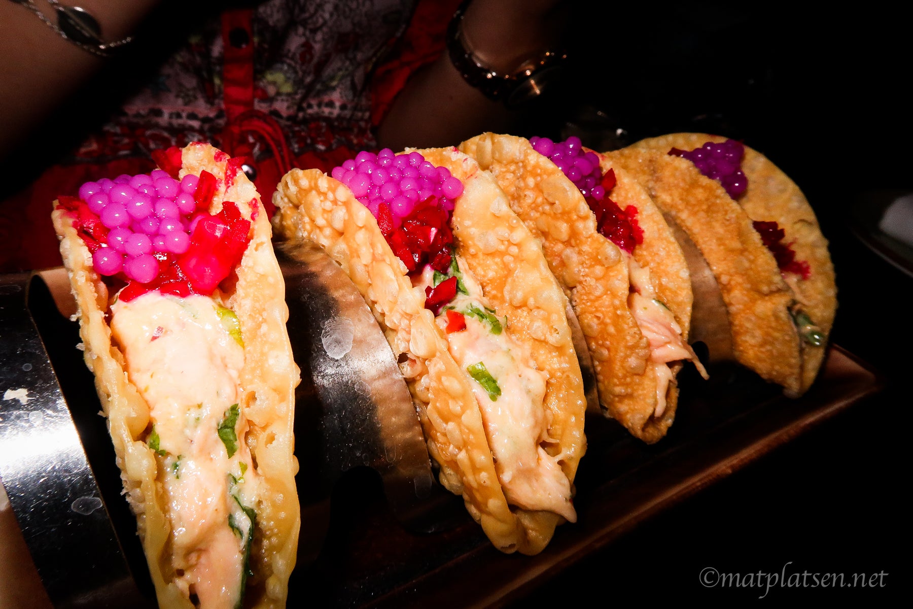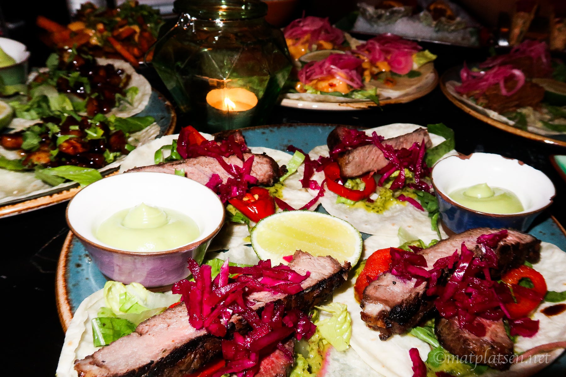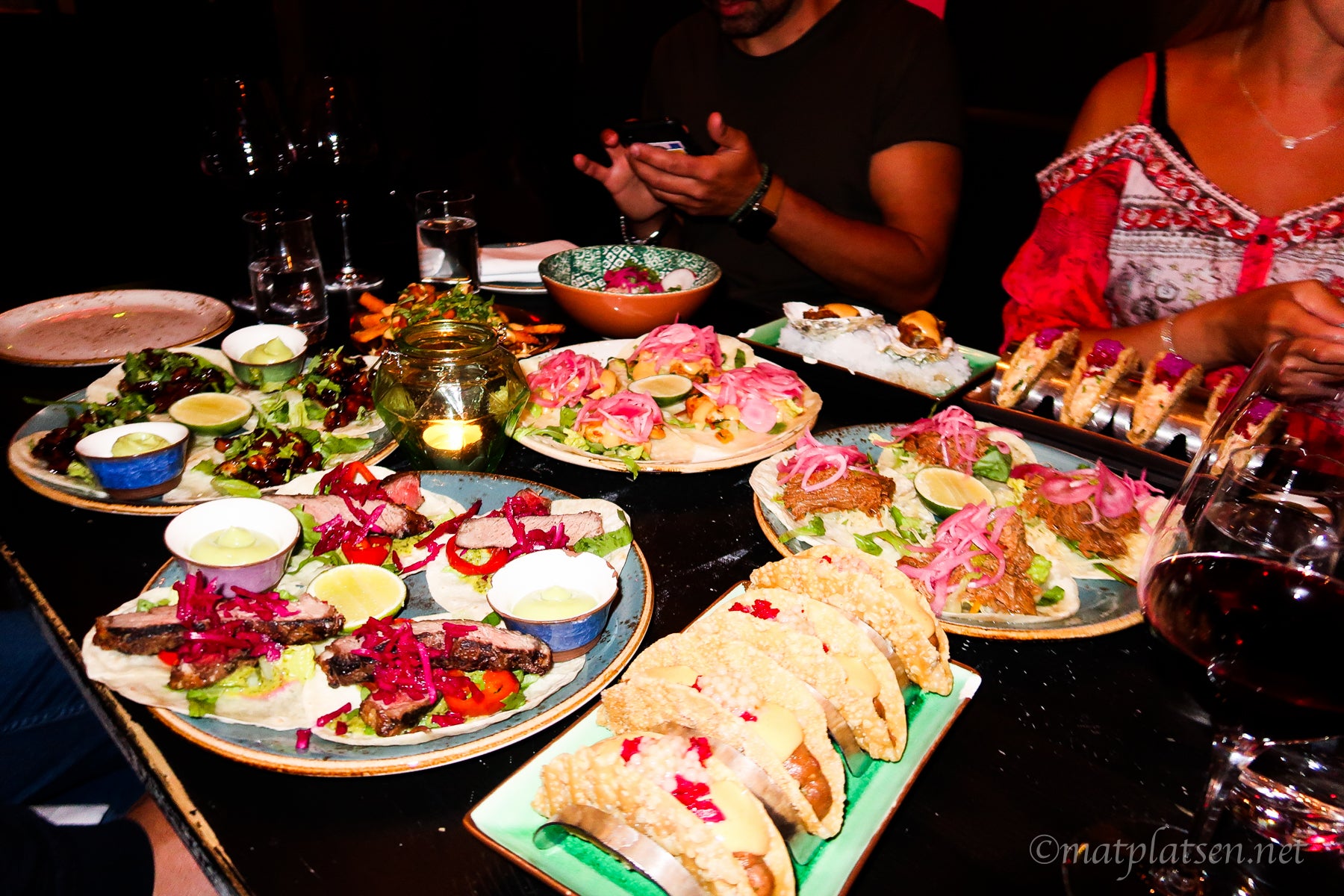 Men resten av maten alltså.. SÅ gott. Rätt starkt, tror det var den dubbelpanerade friterade kycklingtacosen som nästan tog knäcken på oss haha, men smaken var så god så vi kunde int låta bli dem ändå. Hårda tacos med en kräm på varmrökt lax – magiska. Likaså de med bifftartar i. Snygga också! Av de mjuka var de med räkor nog de godaste men de med pulled pork (eller vad det var) kunde man ha skippat. De övriga var grymma.