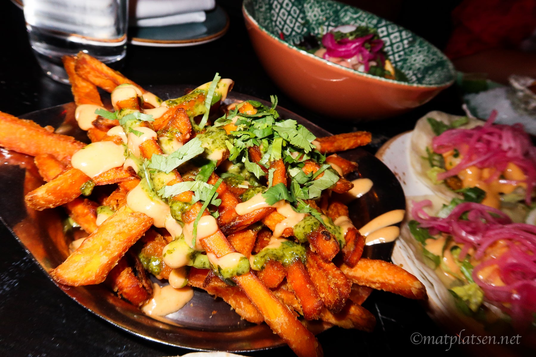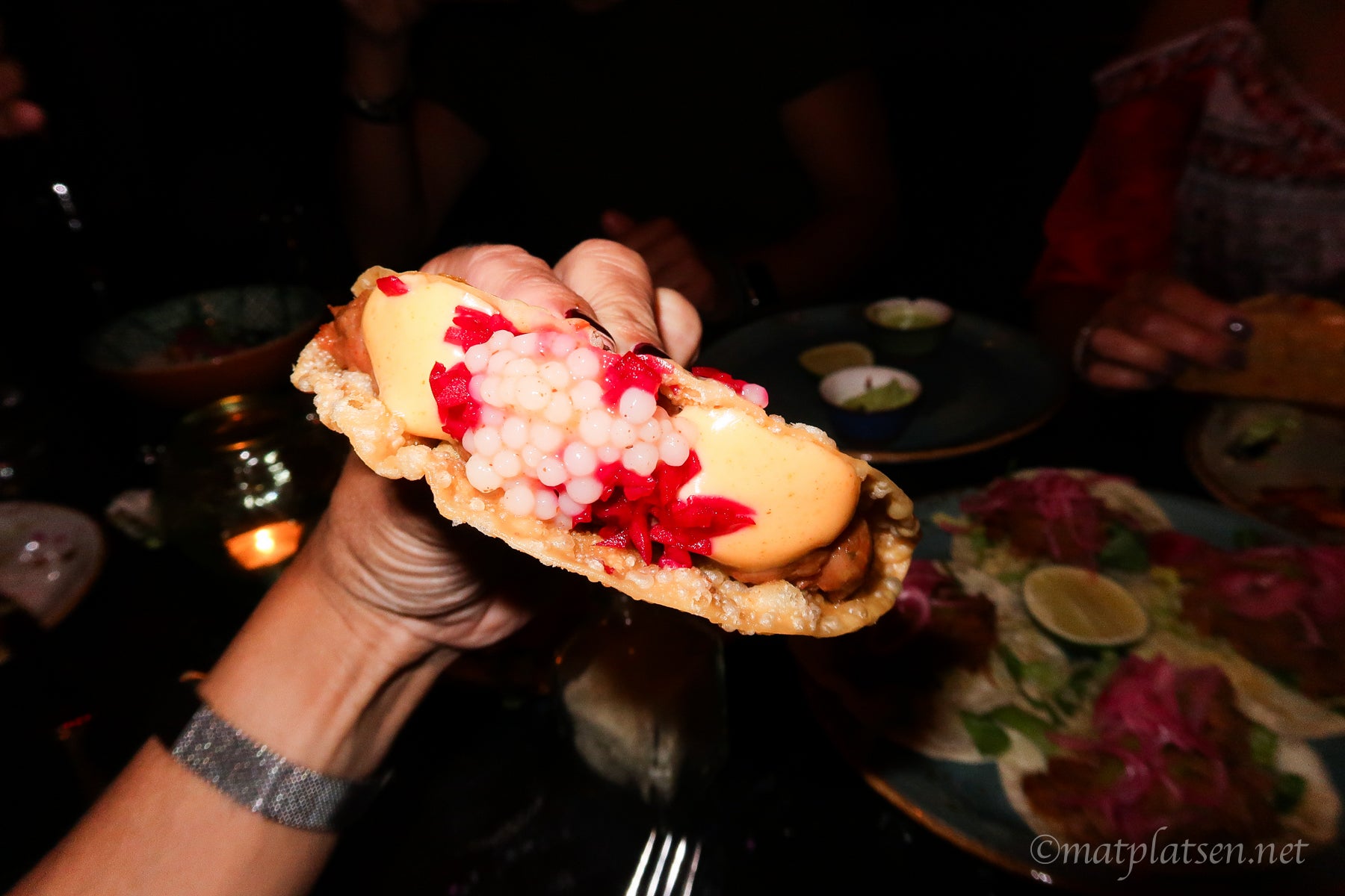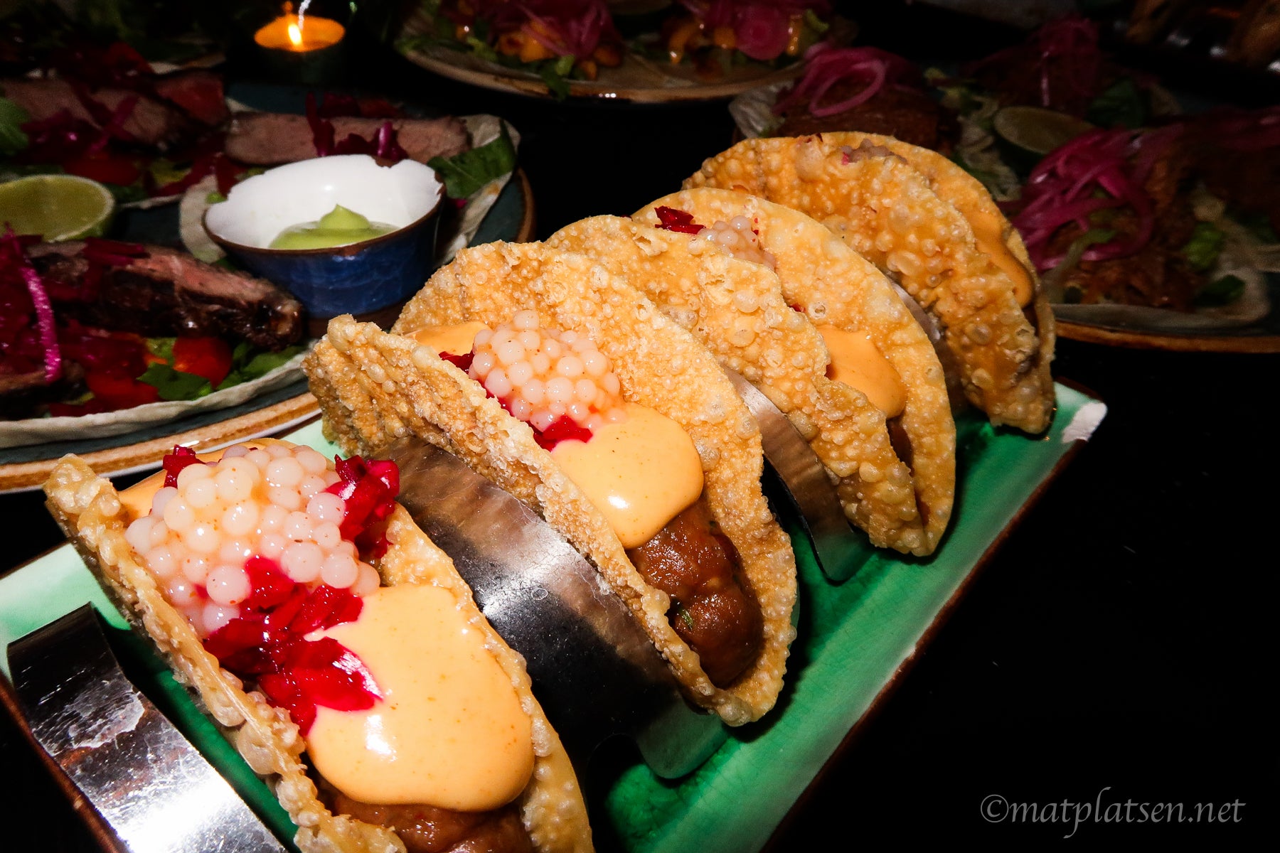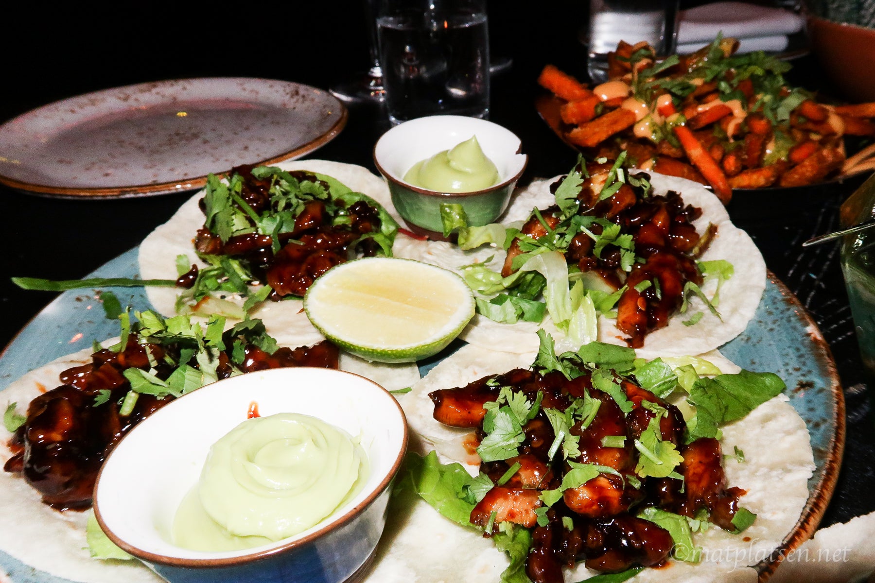 Men resten av maten alltså.. SÅ gott. Rätt starkt, tror det var den dubbelpanerade friterade kycklingtacosen som nästan tog knäcken på oss haha, men smaken var så god så vi kunde int låta bli dem ändå. Hårda tacos med en kräm på varmrökt lax – magiska. Likaså de med bifftartar i. Snygga också! Av de mjuka var de med räkor nog de godaste men de med pulled pork (eller vad det var) kunde man ha skippat. De övriga var grymma.