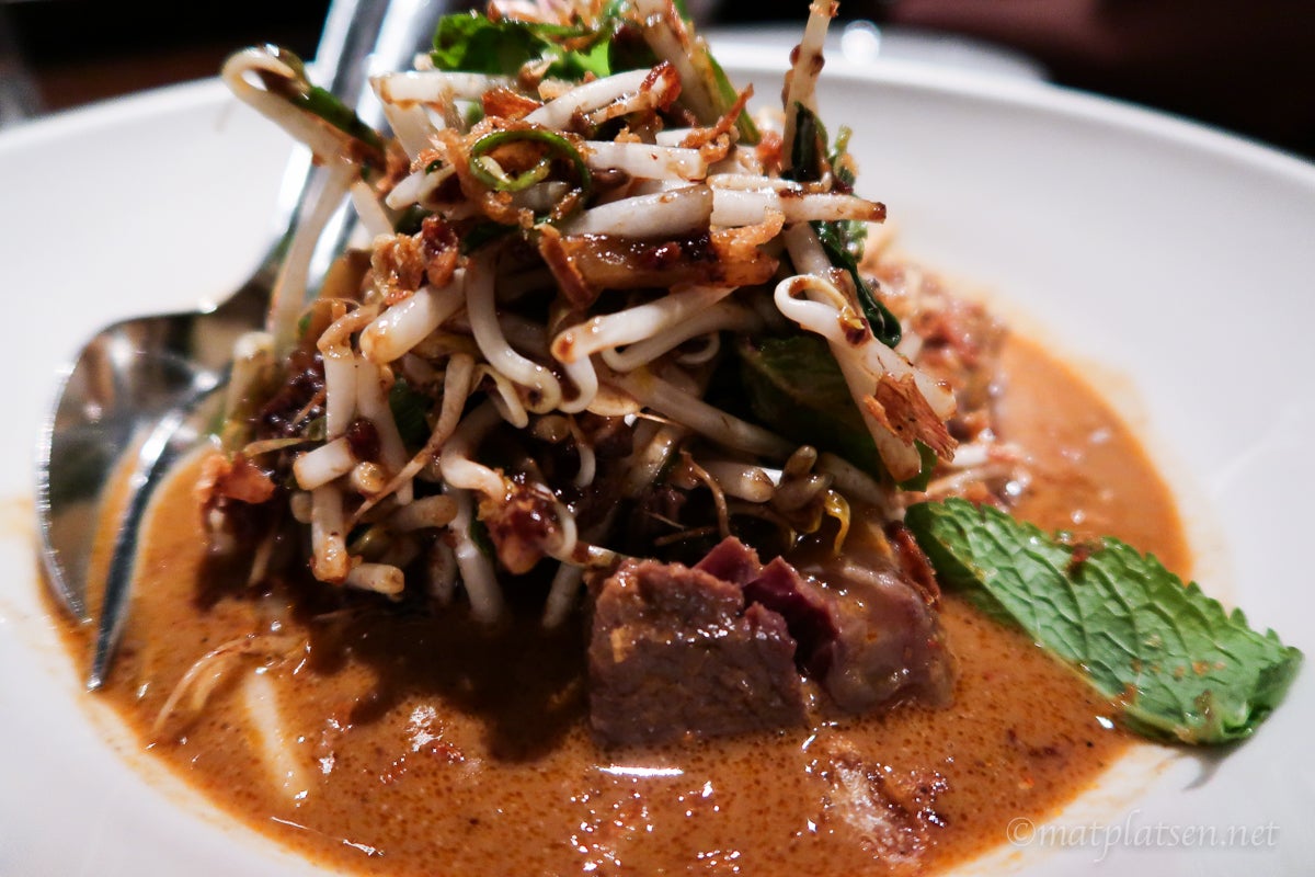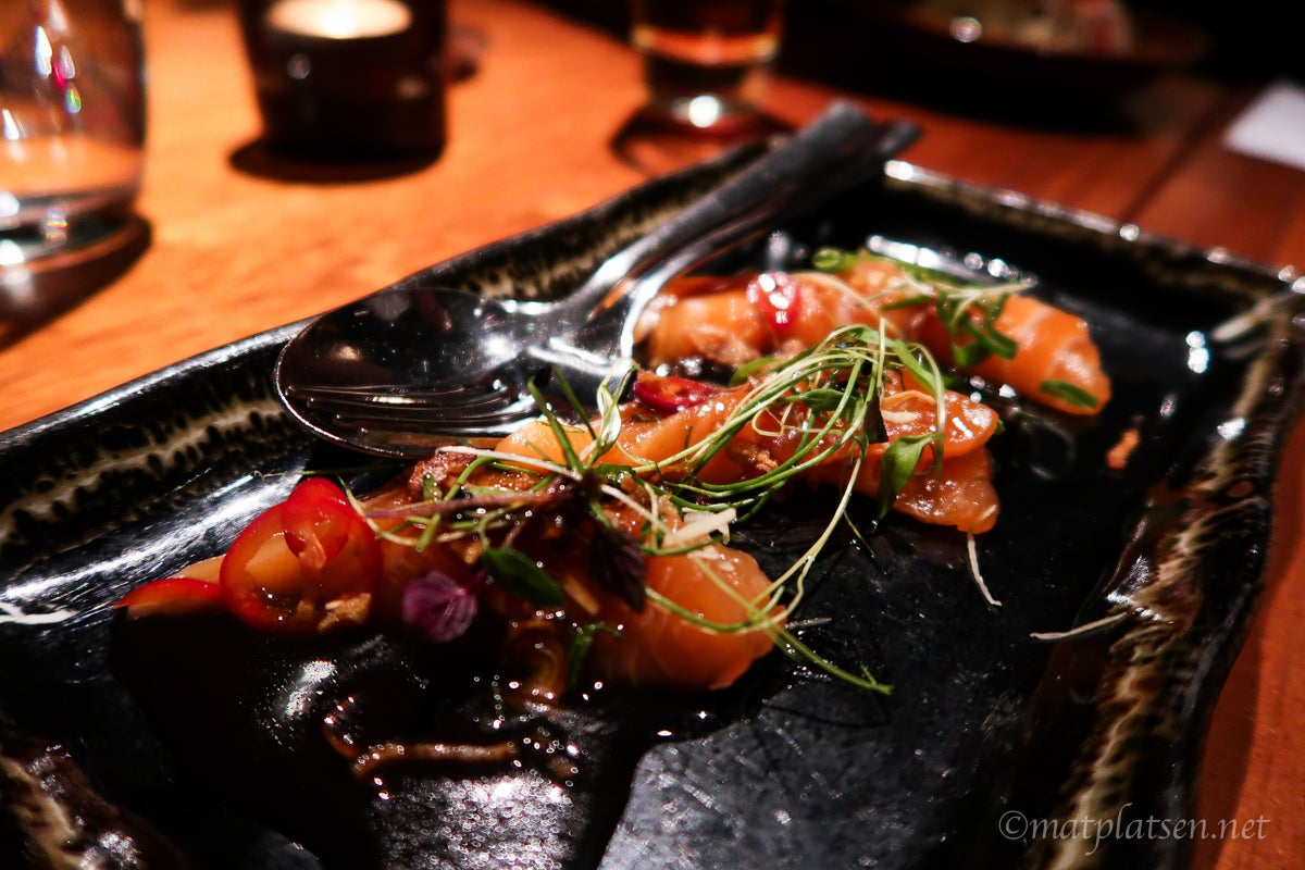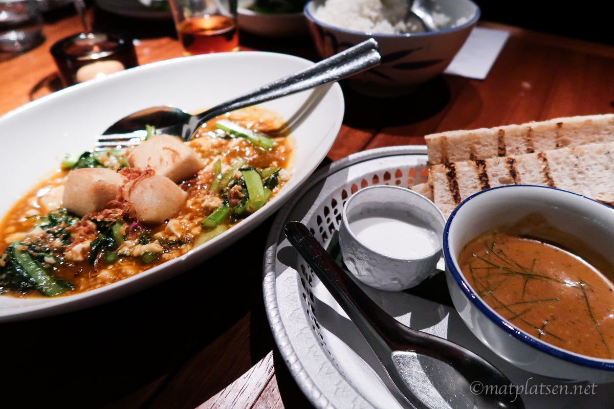 Beställde deras klassiska avsmakningsmeny men Micke som är allergisk mot baljväxter/jordnötter fick specialrätter nästan rakt igenom då det var jordnötter eller soja på baljväxter i nästan allt. Karamelliserad gris och långkokt kind var heeeelt fantastiskt goda, hela friterade softshellkrabbor kul och gott, de andra rätterna helt ok men kanske inget wow för mina smaklökar (och lös Tofu är verkligen inte min grej) . Men väldigt vackra rätter och kul sätt att äta (man delar på alla rätterna och får in dem lite då och då). Tror förväntningarna var lite väl höga, det var inte det bästa jag ätit i mitt liv men väldigt gott och hela upplevelsen i sig var toppen. Rekommenderas varmt. (och plus i kanten för koffeinfri cappucino).