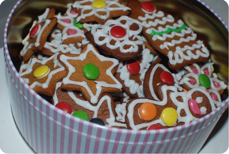 Har ni sett något så färgglatt?! Haha. Knappt så man vill äta dem.. Men kul var det 🙂 Ska göra en omgång med stora pepparkakshjärtan med enbart vit kristyr på nån dag. På hemlagad pepparkaksdeg 😉 Brukar använda detta enkla recept från Santa Maria: