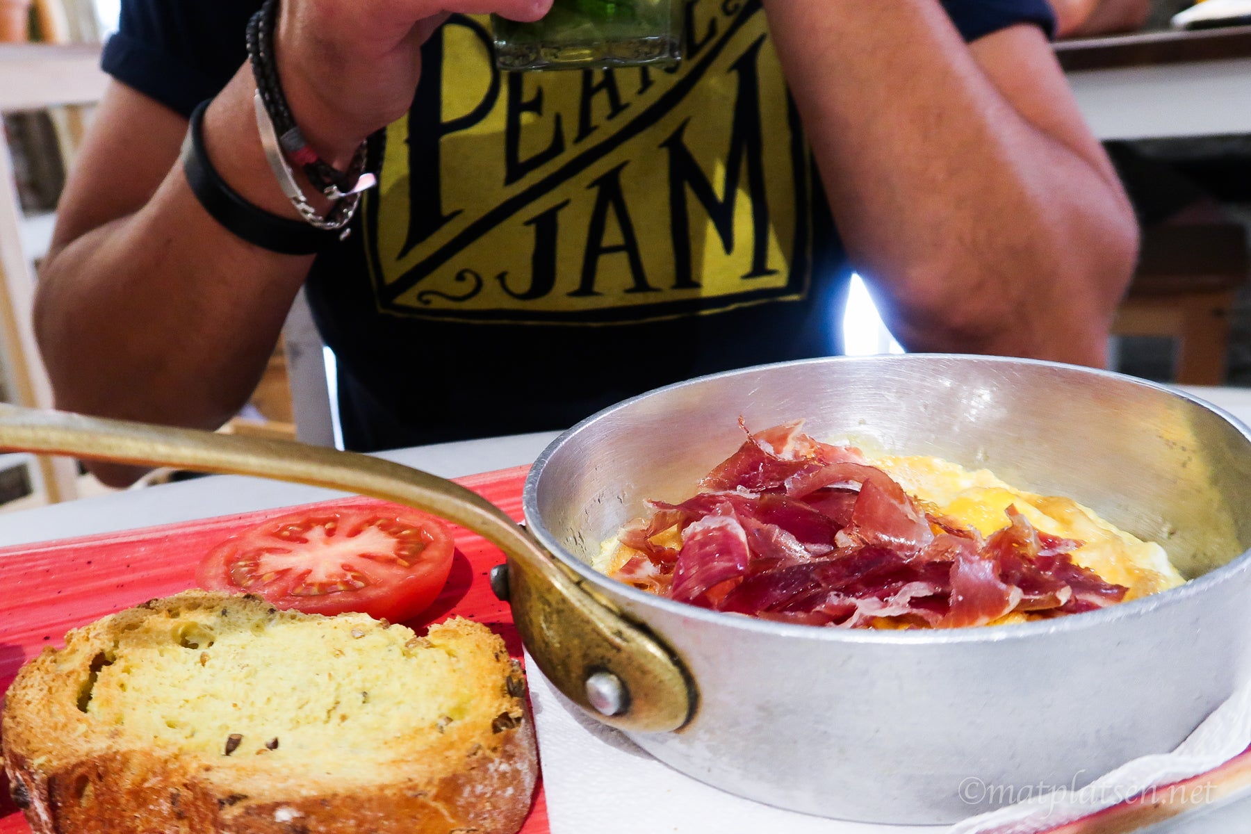 Hittade ett skönt hål i väggen med hysterisk glad och bullrig stämning där personalen gick runt och hällde upp cava i glasen åt höger och vänster som om det vore vatten. Nästan inga turister, bara muntra inhemska lunchgäster. (2 euro för ett glas Cava)