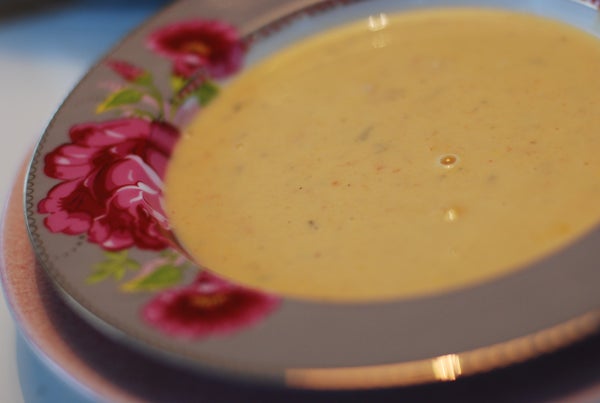 Smaka av med cayennepeppar. Kör soppan slät med stavmixer. Hacka kräftstjärtarna grovt och häll ner dem i soppan och låt allt bli varmt.