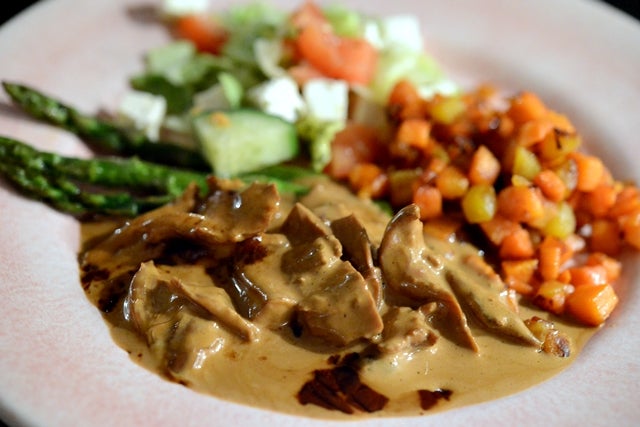 Mamma gjorde den med skivad fläskfilé senast, det blev också jättegott – prova, prova 🙂