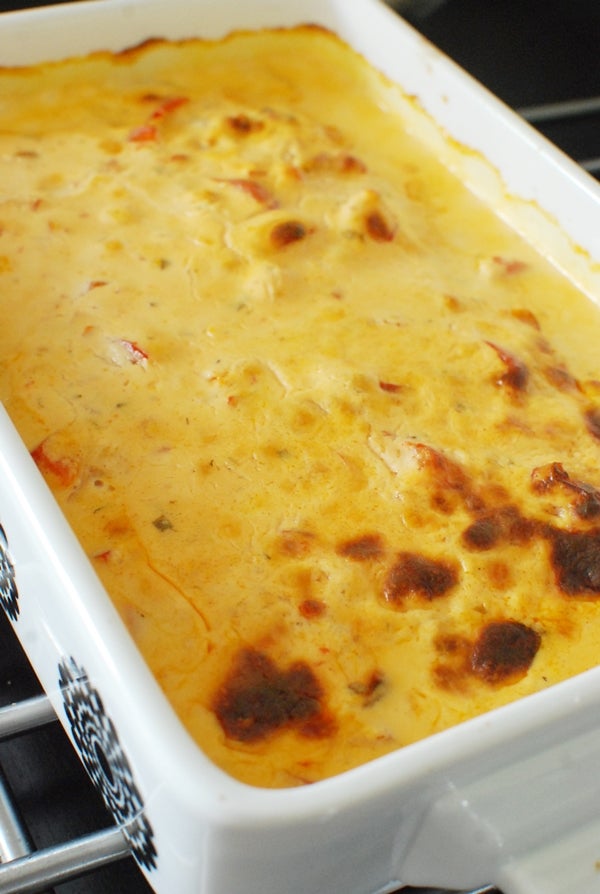 Rör ner grädden i cremfraichen och bred röran överst i formen. In med formen i ugnen 225C ca 25 min, eller tills ytan fått fin färg.
