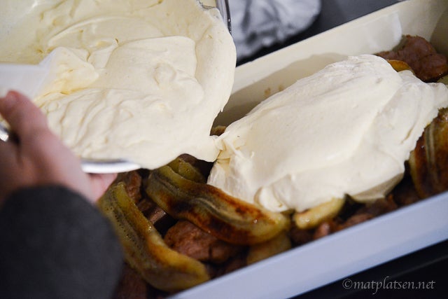 Ingen i min familj är särskilt förtjust i varm banan – förutom jag som älskar det!! Men det blir himla god smak på såsen av dem även om man inte äter själva bananerna så hoppa inte över dem! Sebbe ät T I O skivor fläskfilé, sen fick vi stoppa honom trodde han skulle spricka. Hehe