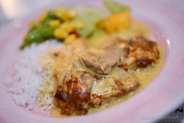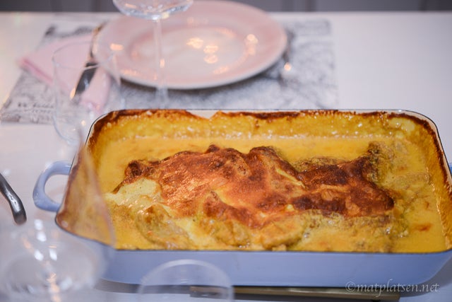 Putsa filéerna och skär i skivor, ca 1 cm. Bryn dem på båda sidor och lägg över i en ugnsform. Häll över stekskyn. Dela bananerna på längden och stek dem i rikligt med smör. Strö över ca 1 tsk socker och låt de få en karamelliserad yta. Lägg över bananerna i ugnsformen. Blanda vispgrädde, salt, peppar, socker och curry. Smaka ev av med mer curry. Vispa sedan grädden och bred den över formen. In i ugnen 200 C ca 30 min tills rätten fått fin färg. Servera med ris och en god sallad.