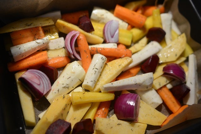 Servera med ugnsrostade rotsaker (jag hade kålrot, morötter i olika färger, palsternacka, rödlök och rödbetor med flingsalt & timjan på) och en god fräsch sallad. YUMMI!!