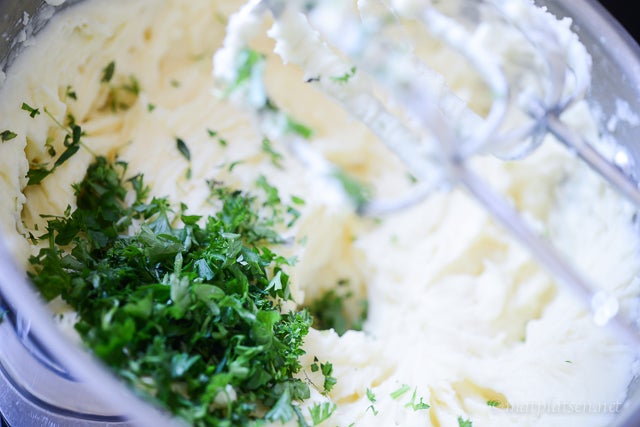 Skala och koka potatisen. Häll av vattnet vispa till mos med smör, grädde och äggulor. Ha i lite grädde i taget och späd med mer om det blir för tjockt men akta så det inte blir för löst. Smaksätt moset med salt och peppar och rör i örterna. Spritsa eller klicka i korgarna. Strö över ost och gratinera i ca 10 minuter, 225 C. (akta så inte filologen bränns).