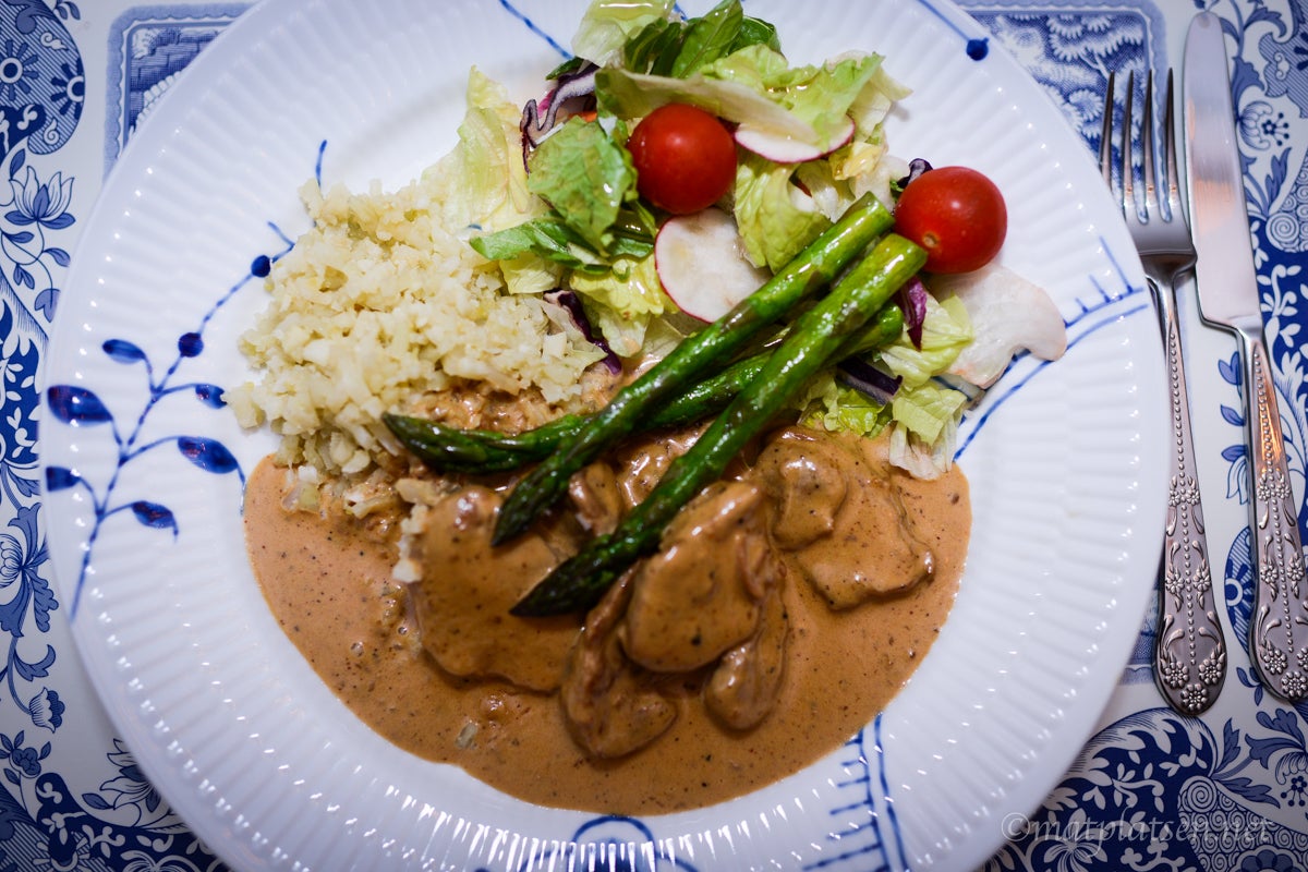 Servera med tex pressad potatis eller ris, stekt sparris och en god sallad.