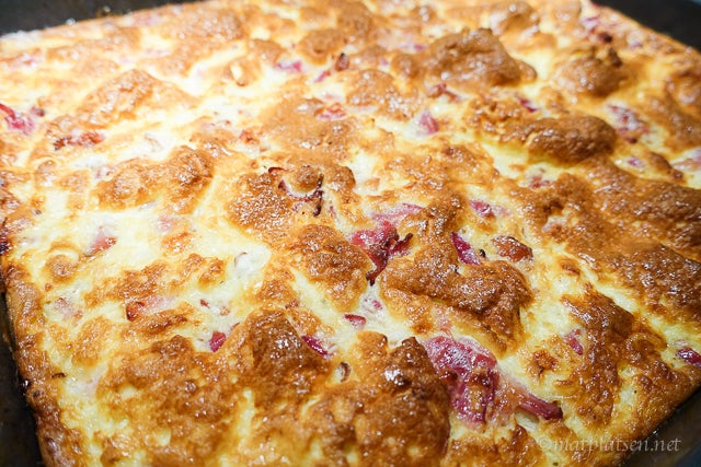 Sätt ugnen på 225g. Finstrimla bacon och fördela på en långpanna. Grädda/stek tills baconet antagit krispig karaktär och fettet bubblar ordentligt. Vispa under tiden upp ägg med grädden och rör ner keson. Övervispa inte – det räcker att det blandar sig. Strö den rivna osten på baconet och sen äggstanningen över det. Grädda till pannkakan är vackert bubblig och fått gyllebrun yta. Ca 20 min.