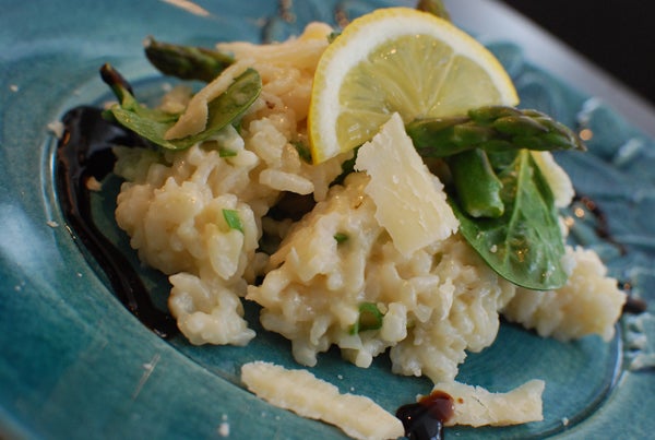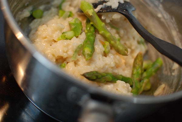Koka sparrisen i lätt saltat vatten. Låt sjuda cirka 2 minuter. Koka upp vatten, vin och fond. Fräs lök och ris utan att det får färg. Ös i lite buljong i taget under omrörning. Tillsätt mer buljong allteftersom. När riset börjar bli färdigt (ca 20 min för att få en bra konsistens!) så blandar du ner sparrisen. Rör ner salladslök och spenat.