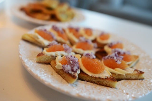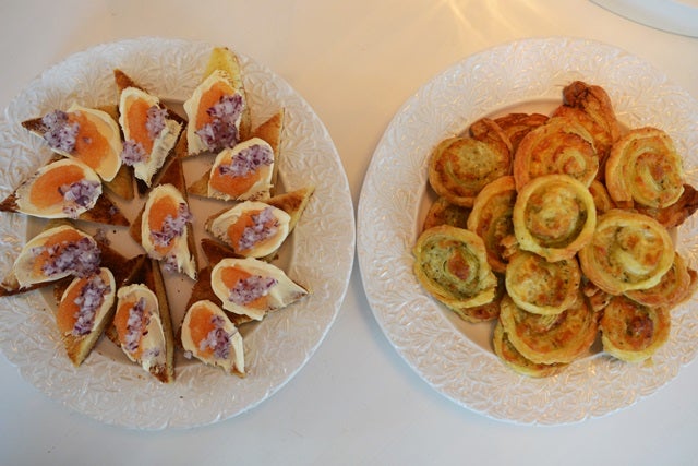 Till fördrink och tilltugg, en drink med sockervadd och smörstekta snittar med löjrom + smetana + rödlök (guuud vad jag älskar min lökhackare!) och smördegssnurror med pesto och ostfyllning.