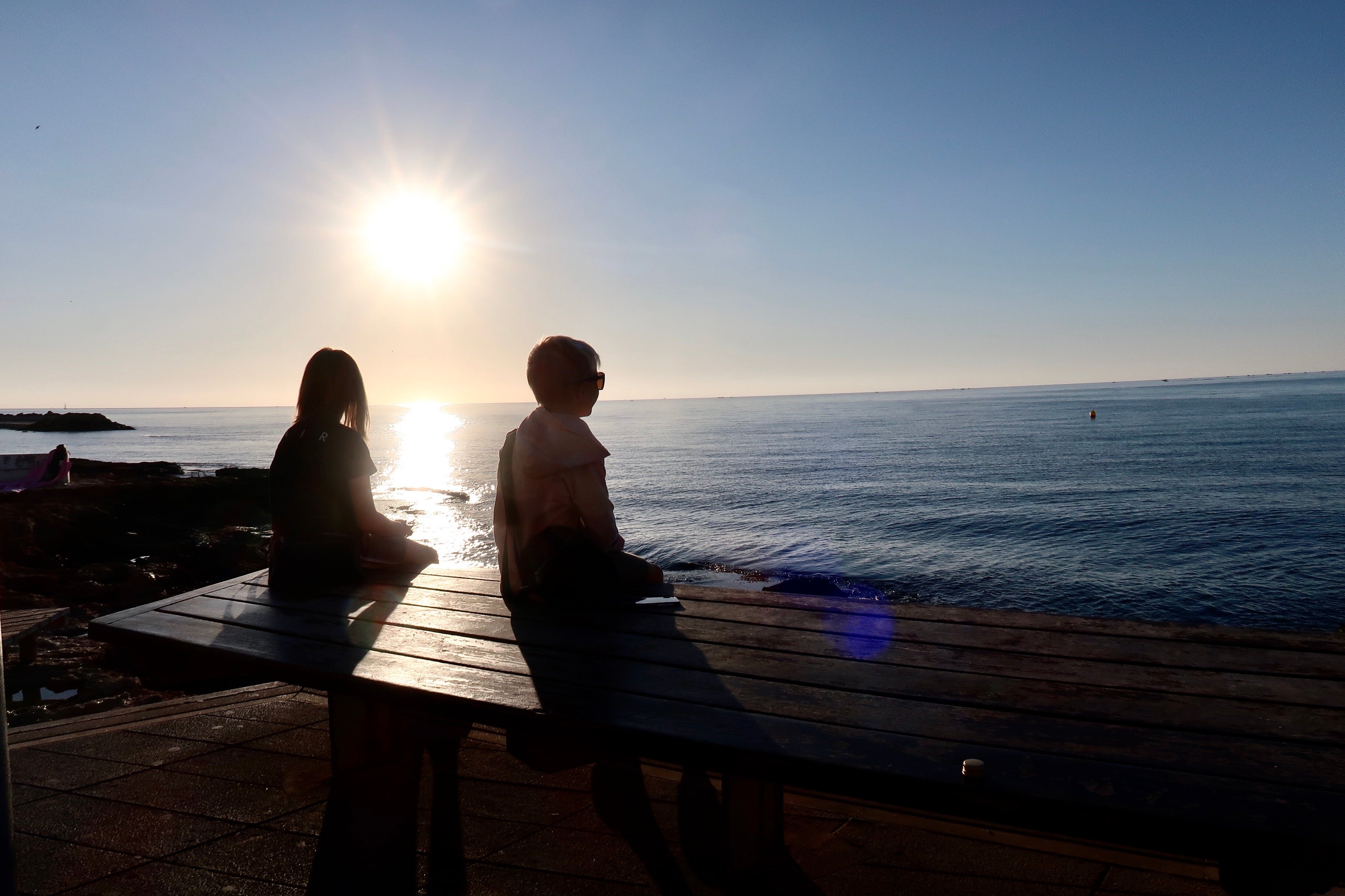 Det finns ju nästan inget mer rogivande än att blicka ut över ett hav som glittrar i morgonsolen. Folk pratar med milda röster, hejar på allt och alla, en och annan fågel hörs och små hundar på morgonpromenad skuttar förbi.
