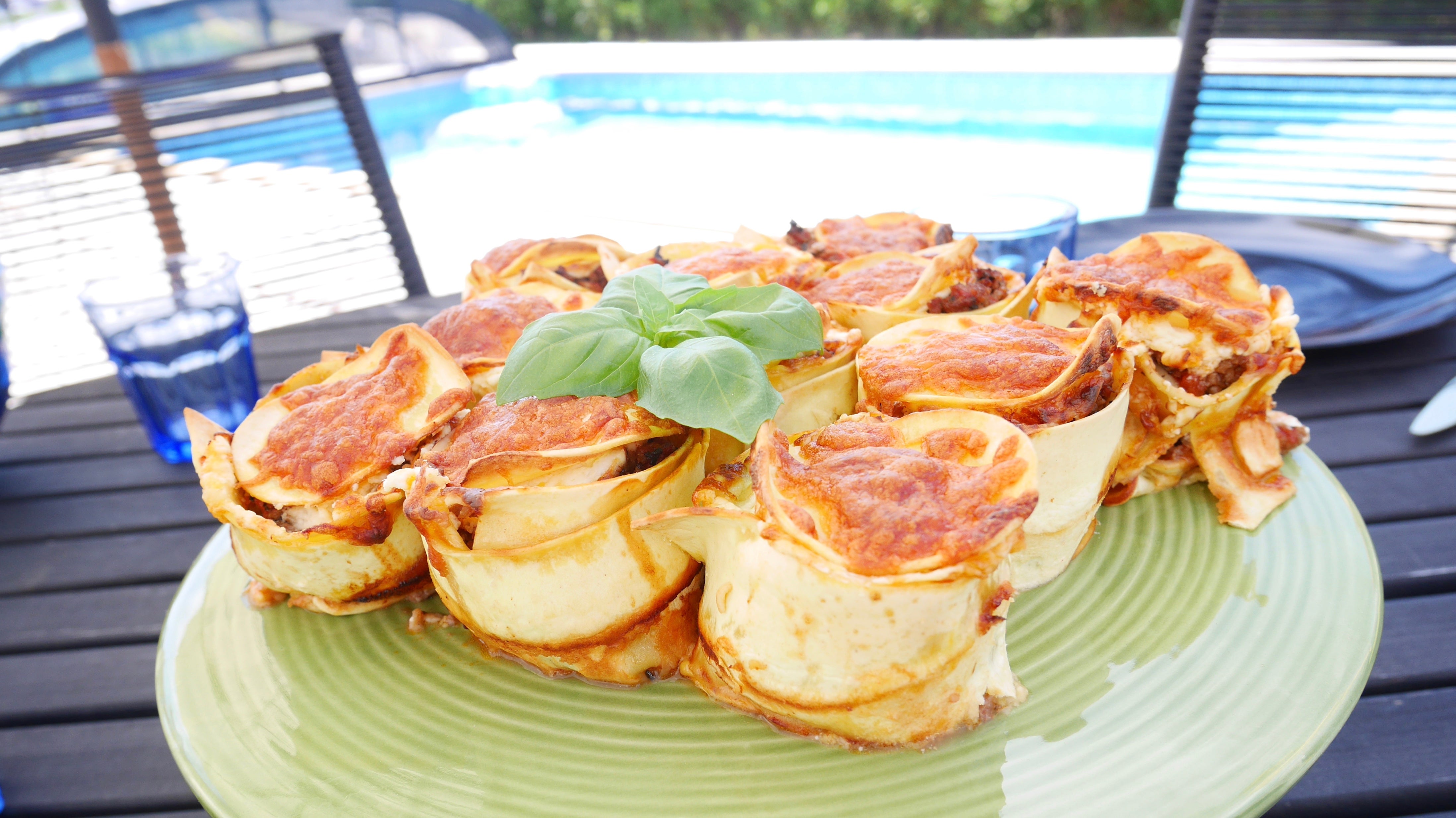 Stansa ut 20 små runda plattor av ett par lasagneplattor, de ska passa i muffinsplåtens botten. Skär sedan lagom breda skivor av lasagneplattorna, detta är ”väggen”.