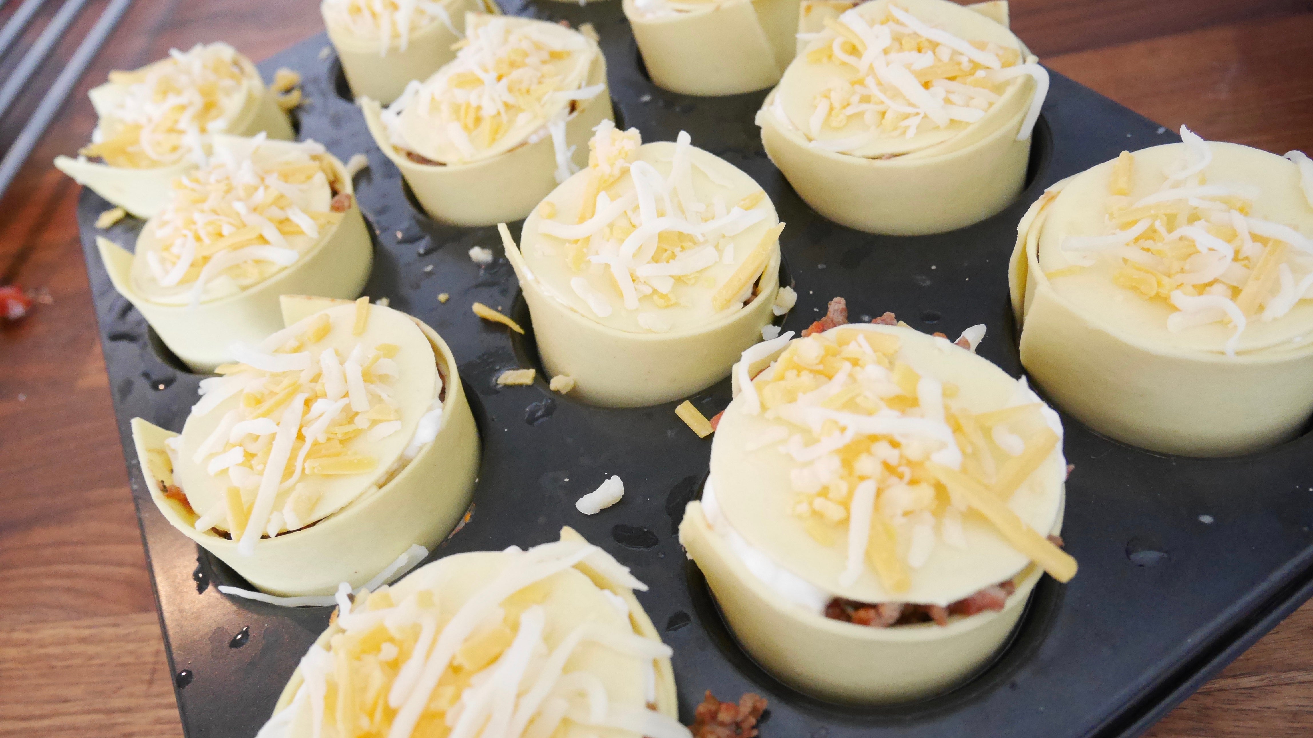 Lägg en rund platta i 10 formar av muffinsplåten. Sätt i remsor som väggar i varje form. Lägg ett lager ost i botten, detta funkar som ”lim” och håller ihop vägg med botten när den smälter. Fyll med en rågad matsked köttfärs och sedan en rågad tesked med ostsås. Lägg på en till rund platta och upprepa samma med köttfärs och ostsås. Toppa till slut med mycket riven ost.