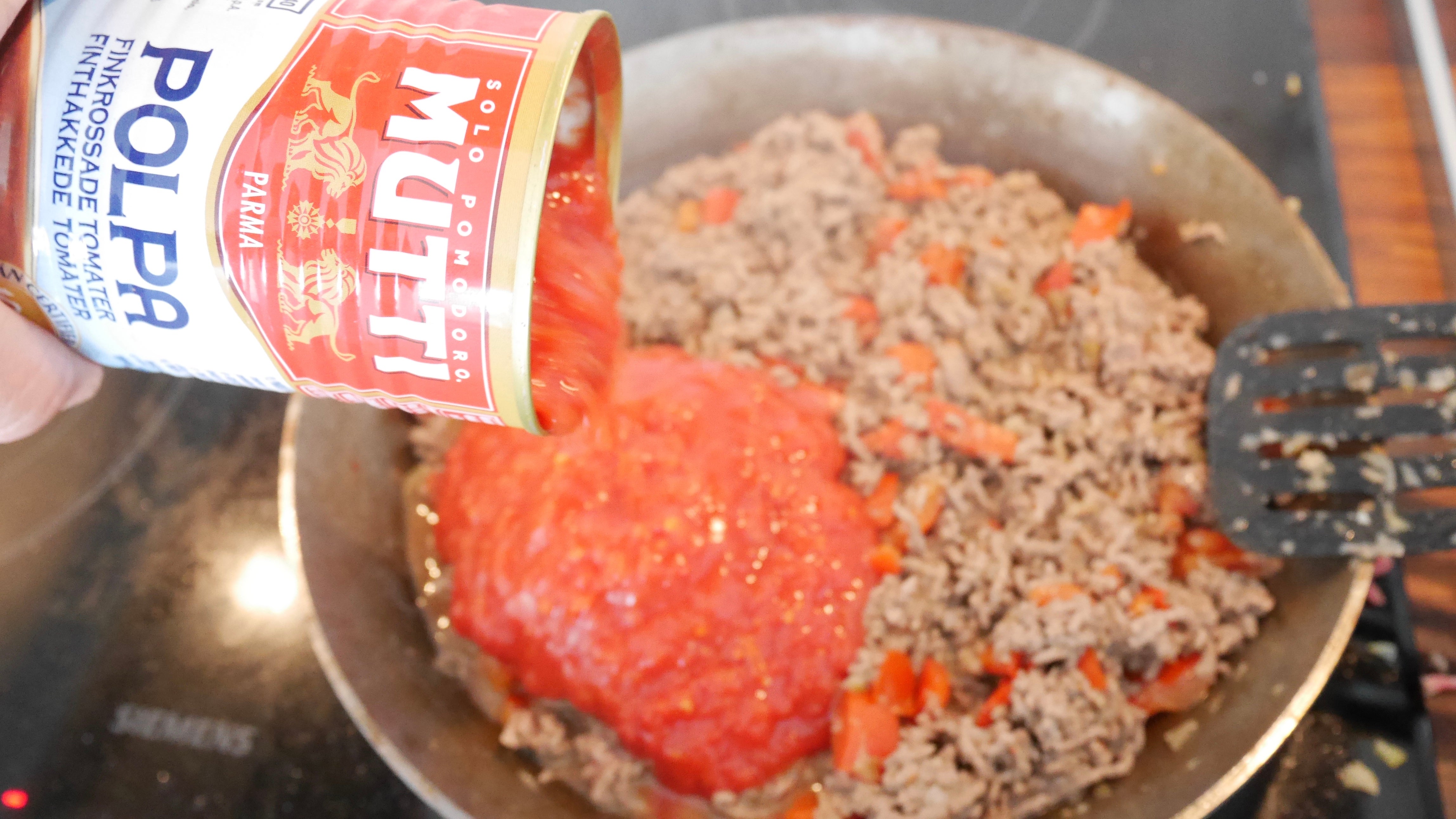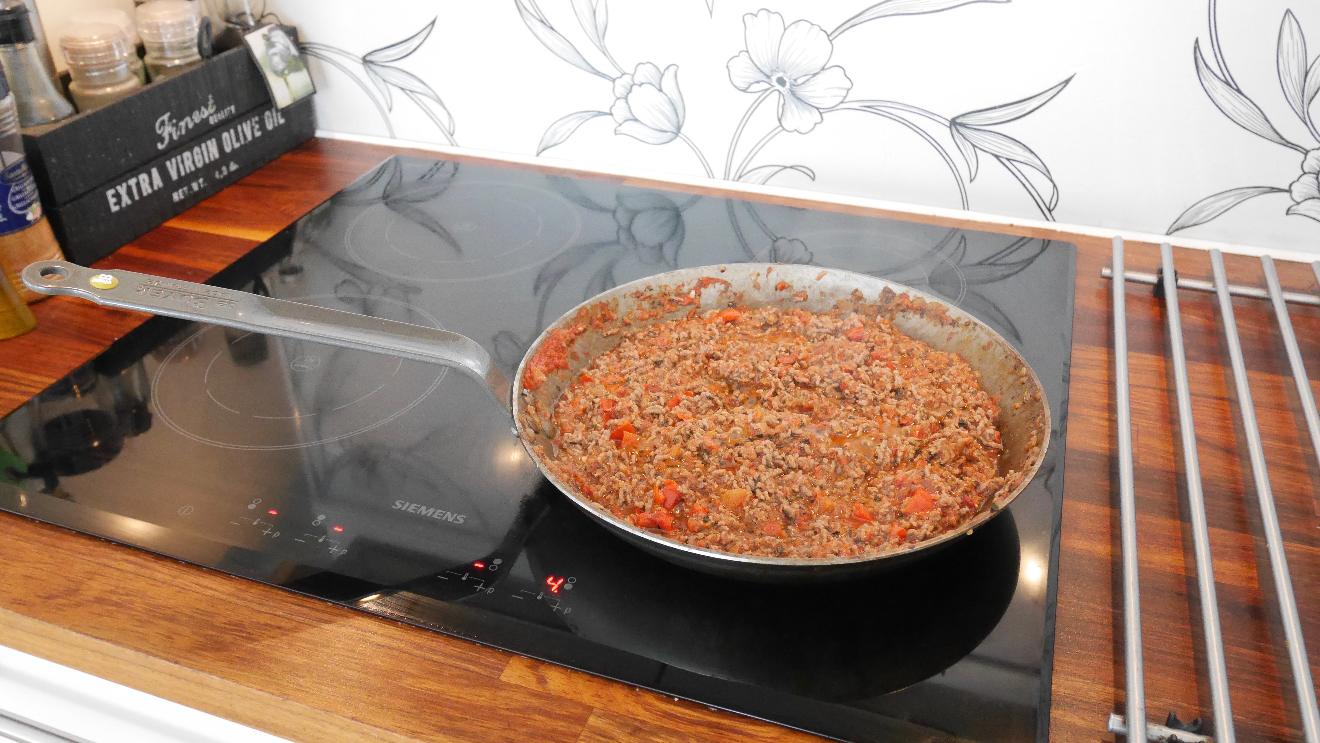 Börja med att lägga alla lasagneplattor i varmt vatten i en skål, detta så att de ska bli mjuka. Hacka lök, vitlök och paprika. Fräs det i lite smör i en stekpanna. Tillsätt köttfärsen och stek tills den är genomstekt. Häll på tomatkrosset och basilika, låt puttra ihop en stund och smaka sedan av med salt och peppar.