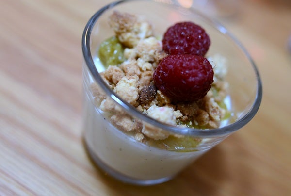 MIddagen avrundades med en söt avslutning i form av Yoghurtcréme med rabarberkompott och havresmul (fast hon hade bytt ut havresmulet mot ”vanlig” smuldeg).