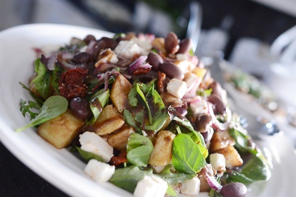 Potatissalladen innehöll förutom potatis, soltorkade tomater, rödlök, fetaost, svarta oliver, ”Italiensk salladsmix”, ca 1dl olivolja, 1 msk balsamico och 1 tsk dijonsenap som blandas.