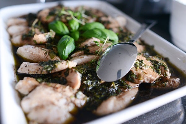 Blanda marinaden och häll över kycklingen när den är varm. Låt stå och dra kallt.
