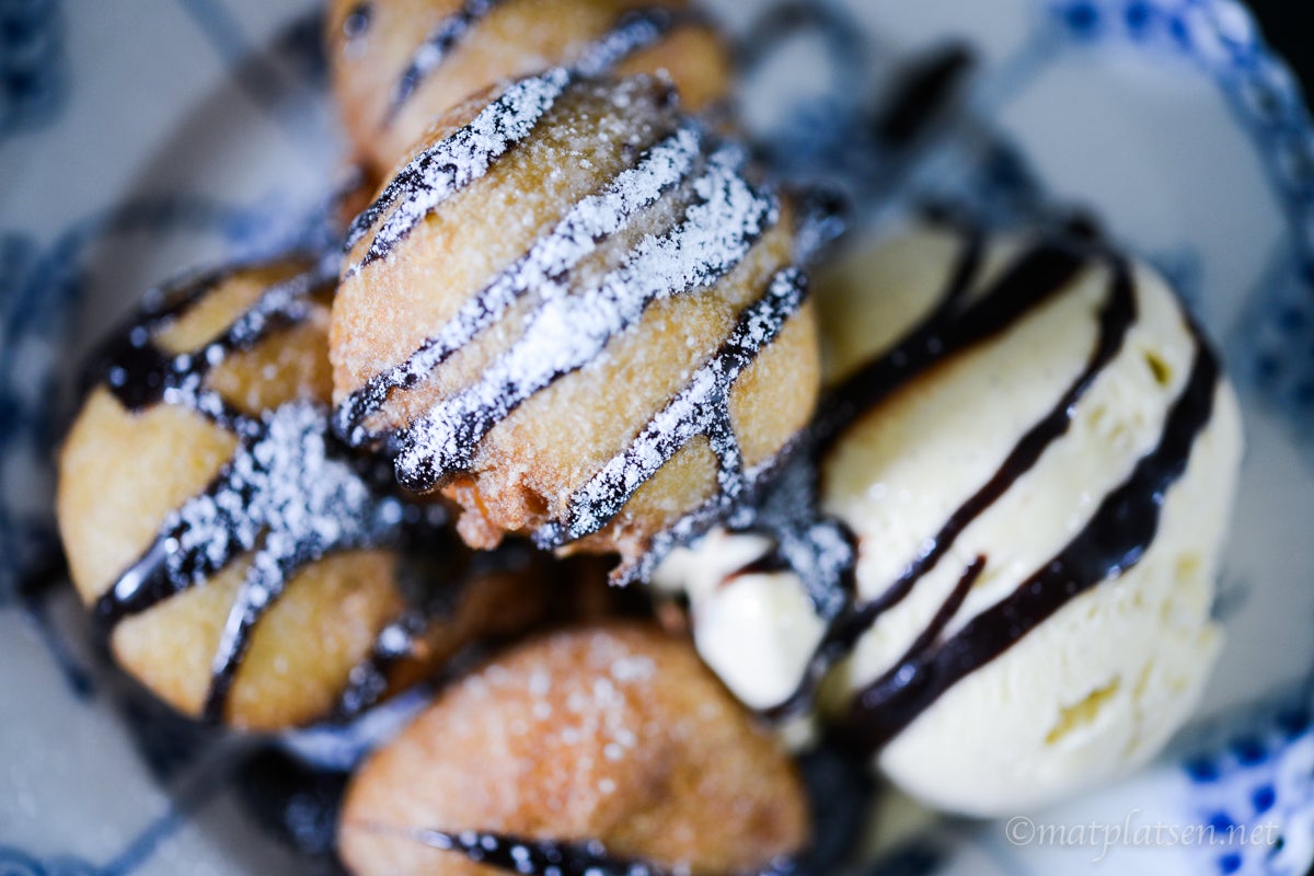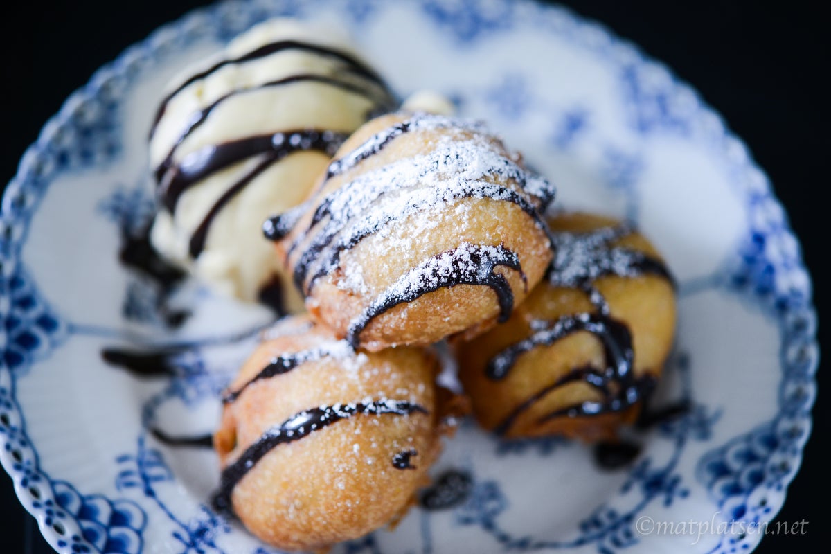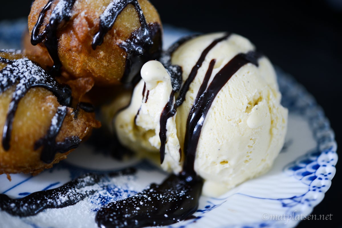 Blanda de flytande ingredienserna (mjölk, ägg, olja) i en bunke och vispa sedan ned pannkaksmixen (finns att köpa på ”amerikanska hyllan”). Låt stå att svälla en stund. Värm fritösen till 180 C. Doppa kakorna ordentligt i smeten och fritera dem några stycken i taget i ca 2-3 minuter tills de fått fin färg och känns krispiga på utsidan. Låt rinna av på hushållspapper och servera dem sedan genast med glass och chokladsås till och pudra över lite florsocker.