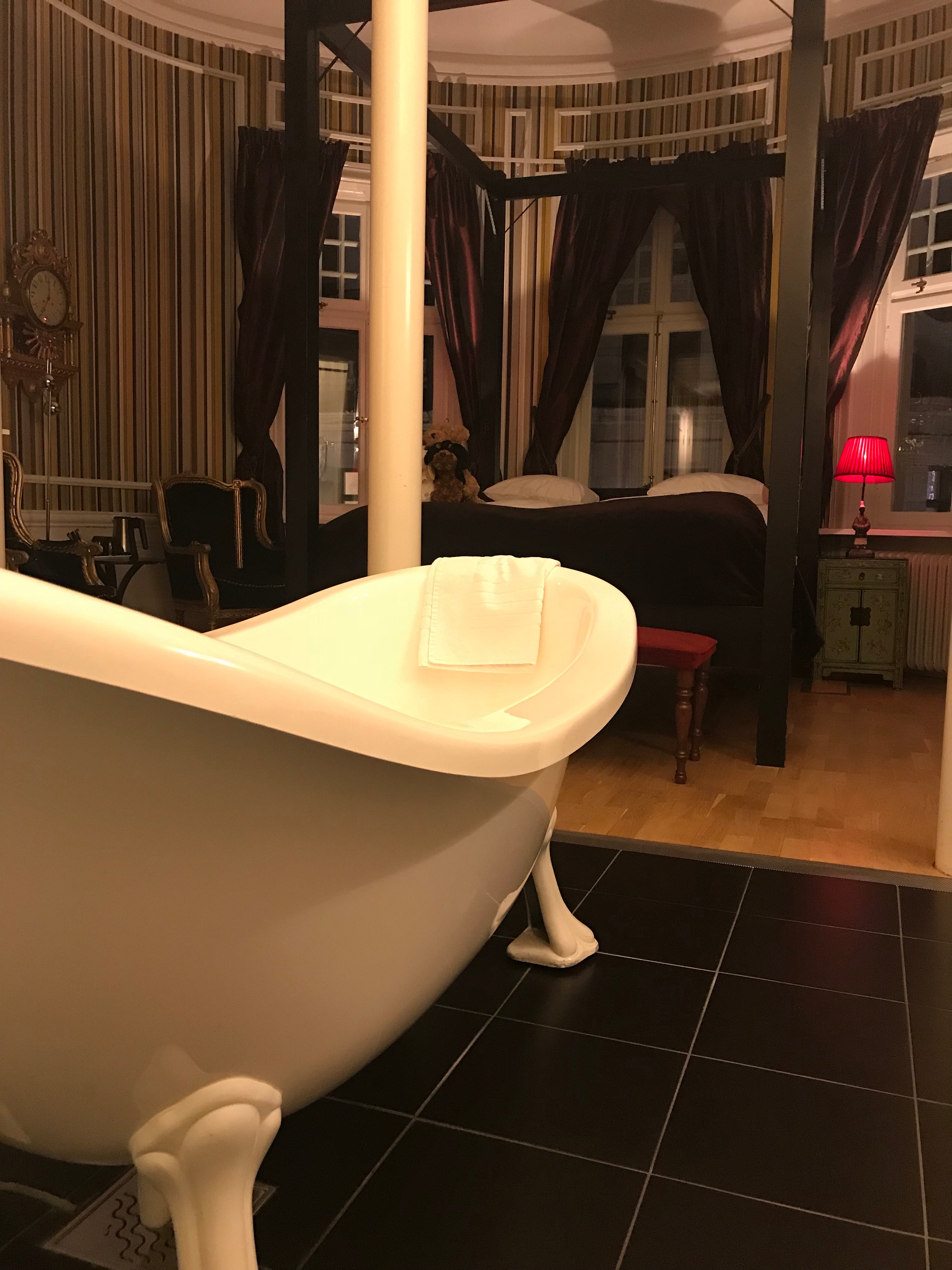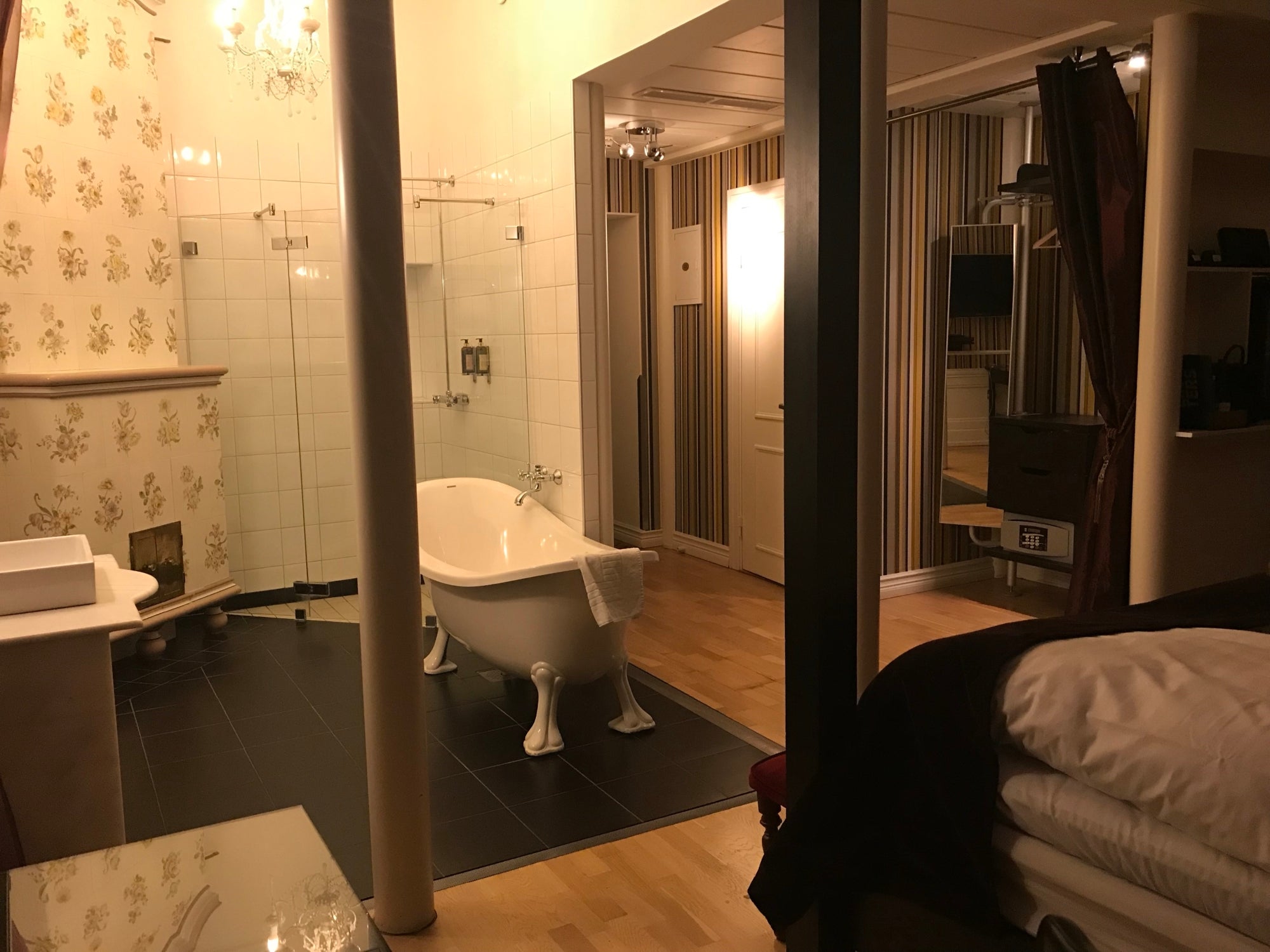 Checkade in på Kung Carl och fick ett så läckert rum med badkar i sovrummet 🙂