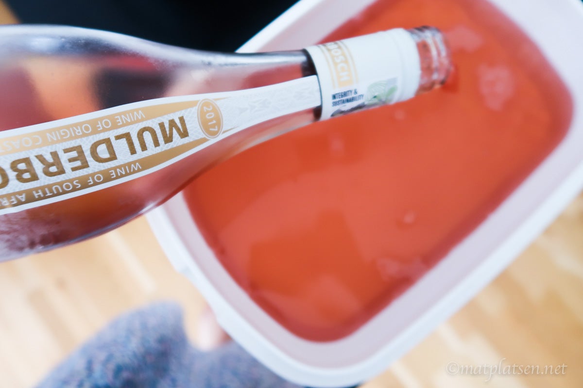 Häll rosévinet i en låg vid form och sätt in i frysen över natten.