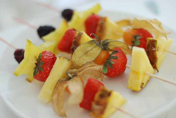 Skölj och rensa bär och frukter. Skär frukten i bitar och varva på spett.