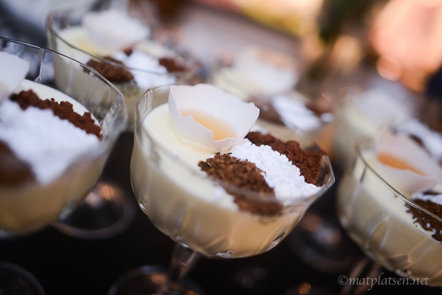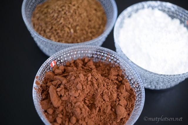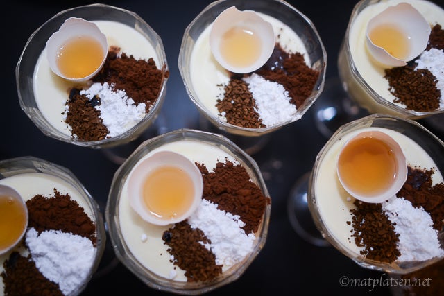 Ca 30 minuter innan servering ställes de in i kylen. Precis innan servering – lägg på florsocker, nescafé och kakao i små ”öar”. Häll 1 msk cognac i äggskalet och placera mitt på.