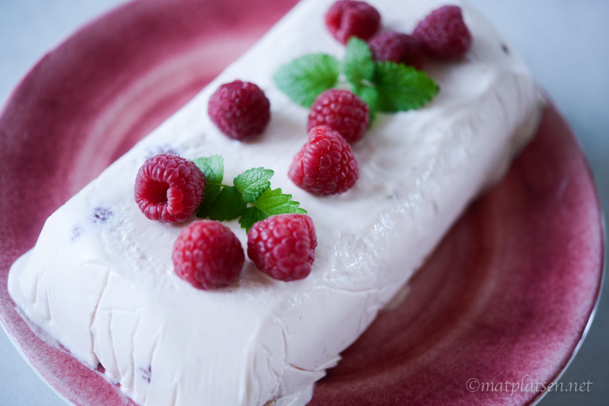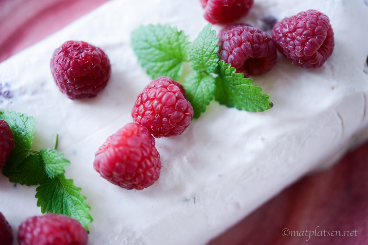Klä insidan av en 2-liters avlång brödform med plastfolie. Dela äggen. Vispa vitorna till hårt skum. Vispa gulorna och florsockret luftigt. Vispa grädden och blanda med vitorna, äggulevisp, kvarg, skal och saft av lime och hushållsfärg. Rör om till en jämn smet. Varva smet, kex och hälften av hallonen i formen. Frys i minst 5 tim. Låt stå i kyl 1 tim före servering. Stjälp upp och garnera med hallon och myntablad.