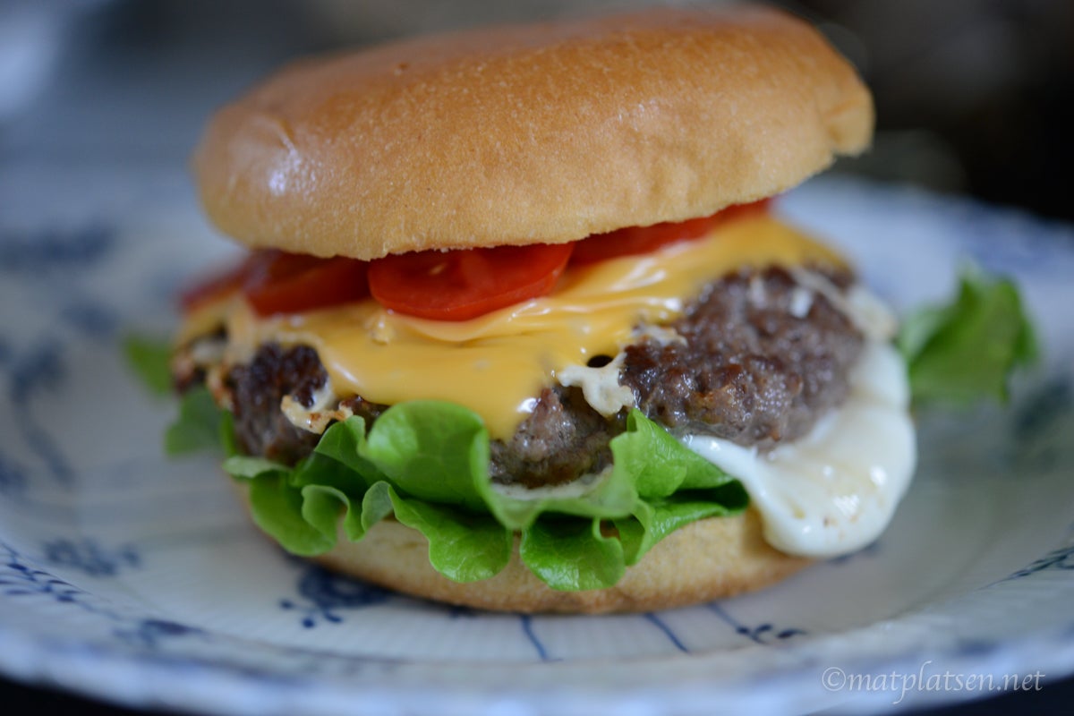 Dela nötfärsen i 3 delar, platta ut och stansa ut mitten. Samla i hop färsen som blir över och gör en 4:e burgare. Salta och peppra och stek i stekpanna på ena sidan. Vänd dem och kläck i ett ägg i mitten på varje burgare. Stek tills de är genomstekta efter tycke och vänd ev en gång till och stek som hastigast för att få stekyta på ägget på båda sidor om så önskas. Lägg på ostskivorna sp de börjar smälta och ta av burgarna från plattan. Lägg i hop dem i hamburgerbröden med sallad, tomat och majonnäs.