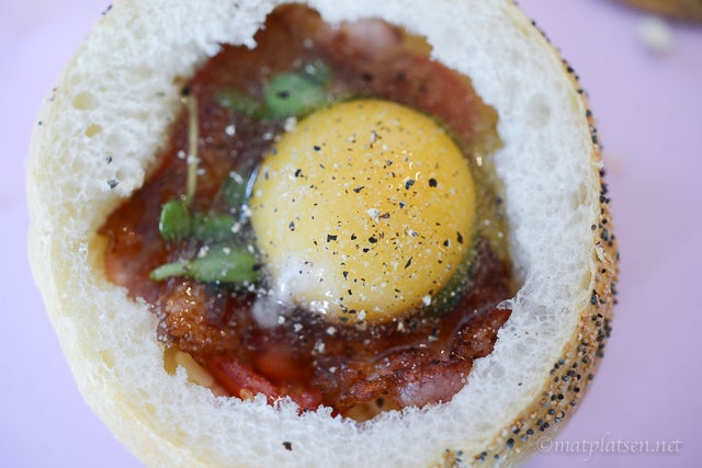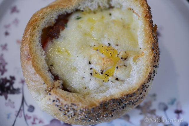 Gröp ur frallan och lägg i stekta bacon, lite grönsaker (tex tomat, paprika, babyspenat). Knäck ett ägg och häll i, salta & peppra och toppa med lite riven ost. Slå in dem i folie. In i ugnen 225 C ca 10 min tills ägget stannat. Servera genast. Mums!