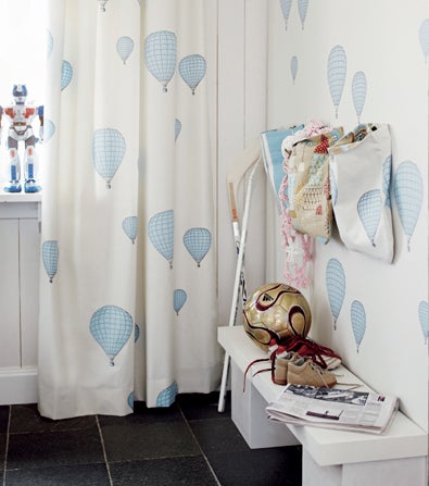 Visst är det kul att kolla tapeter till barnrum. Vi har Kaspar från Sandbergs i vår äldste sons rum. Den är ljusblå med en massa fina hus på. Luftballongerna är ju också jätte fina!