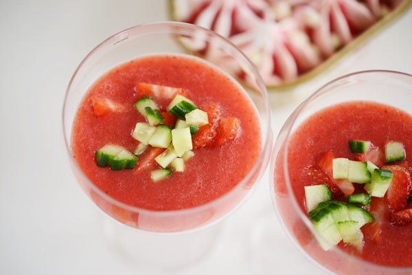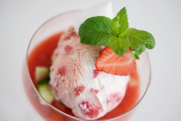 Mixa en halv liter jordgubbar med lite socker till en slät soppa. Skala en bit gurka, ta bort kärnhuset och skär i mindre bitar. Blanda gurkbitarna med tärnade jordgubbar i proportionerna 1 del gurka och 2 delar jordgubbar, lägg i botten av en skål. Lägg en kula glass ovanpå och avsluta med att hälla soppan runtom.