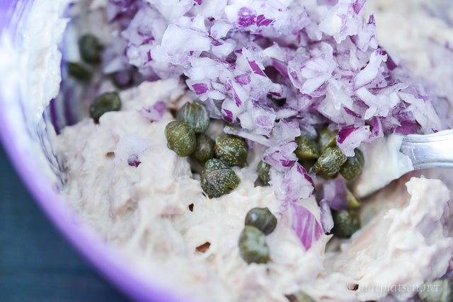 Hacka rödlöken fint och lägg att dra i kallt vatten en stund. Låt rinna av ordentligt. Blanda lök, tonfisk, majonnäs och kapris. Smaka av med salt & peppar.