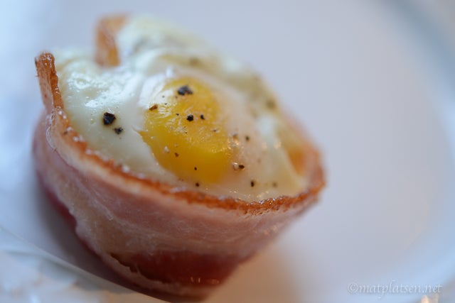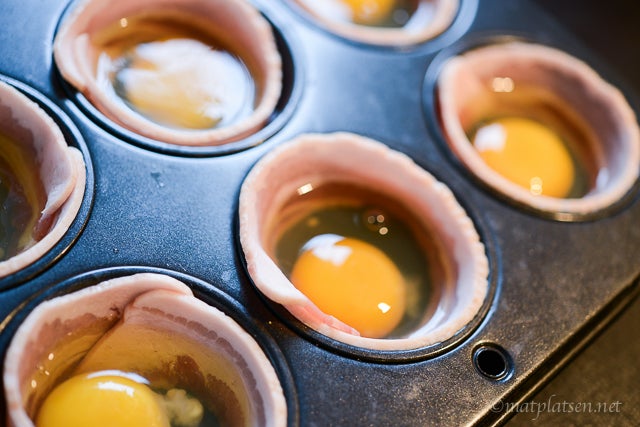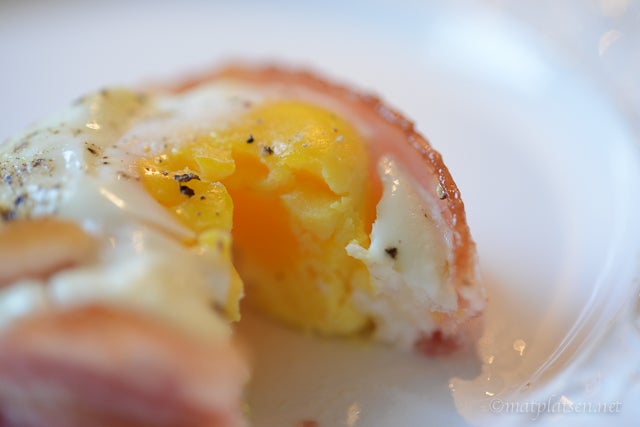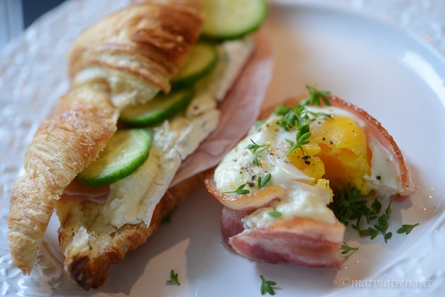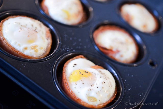 Man behöver bara ägg och bacon och salt & peppar. Och en muffinsplåt. Vira en skiva bacon runt innekanten i varje hålighet i plåten. Knäck ett ägg och häll i. Salta & peppra. (Vill man kan man bottna med en skiva formbröd längst ner, skär ut en rundel som passar i botten och lägg i den innan ni knäcker i ägget). Sen gräddas dessa i 200 grader, ca 8-10 minuter.
