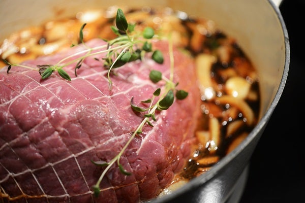 Blanda ihop porter, svartvinbärssaft, soja, enbär, pepparkorn, timjan och köttbuljongtärningarna. Skiva lök och vitlök och lägg i. Låt spadet koka upp och lägg i köttbiten (med nätet kvar runt). På med lock och låt sjuda ca 1 1/2 h. Vänd köttet då och då (med termometer är köttet klart vid 75 grader)