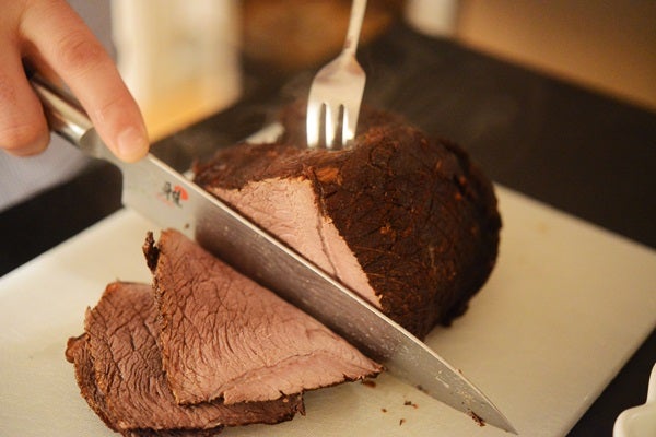 Ta upp köttet och låt ligga inlindat i folie ca 15 min. Skär sedan i tunna skivor.