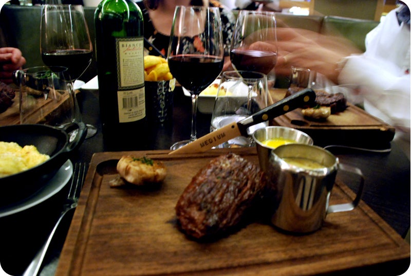 Till huvudrätt valde vi kött. och det var en hel vetenskap i sig. Man kunde välja på olika slags kor, uppfödda på olika sätt, och hängmörade i olika antal dagar. Och när man väl valt det skulle man välja styckdel.. Tog sin tid 🙂 (fick dock hjälp av servitören som om ut med en vagn fullastad med kött och visade de olika delarna och sorterna)