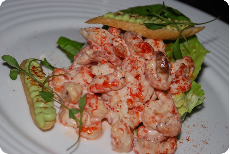 Vi började med förrätt. Min var faktiskt ingen wow-upplevelse, Crayfish and shrimp cocktail, avocado, Marie Rose sauce.