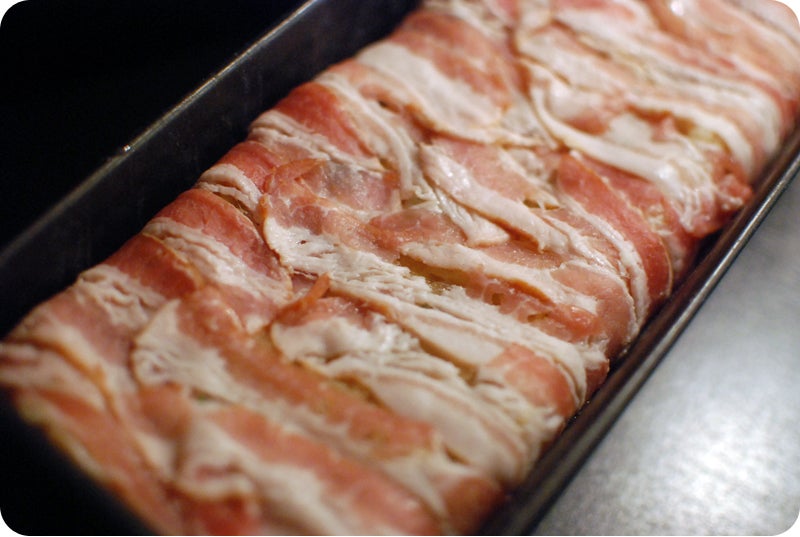 Sätt ugnen på 185 grader. Kläd en avlång sockerkaksform med baconskivorna genom att lägga skivorna rakt över formen så att ändarna hänger ut på kanterna. Lägga baconskivorna som ”takpannor” där skivorna överlappar varandra.