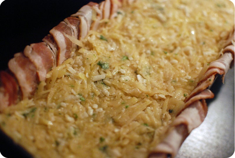 Pressa ut vätskan från potatisblandningen och fyll den baconklädda formen.