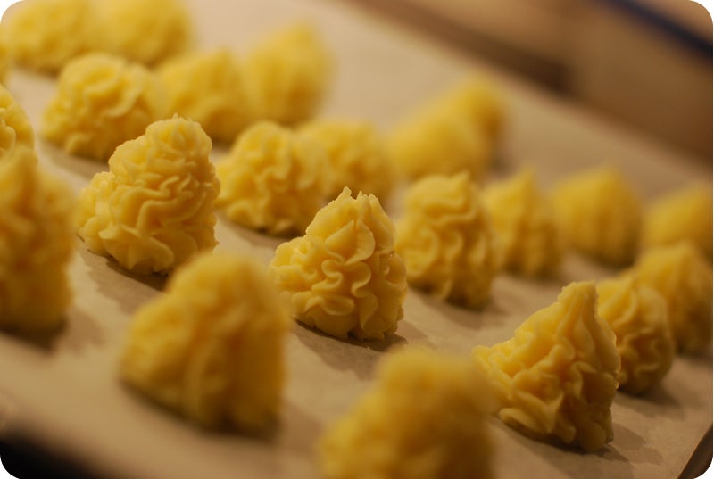 Gör potatismos som ni brukar och blanda bara i äggula i och spritsa ut på bakplåtspapper. Superenkelt men mycket festligare!