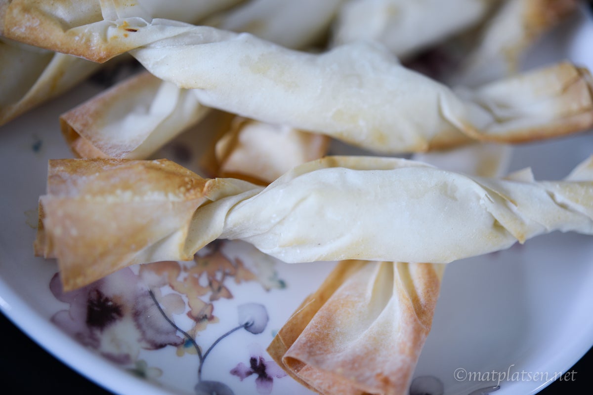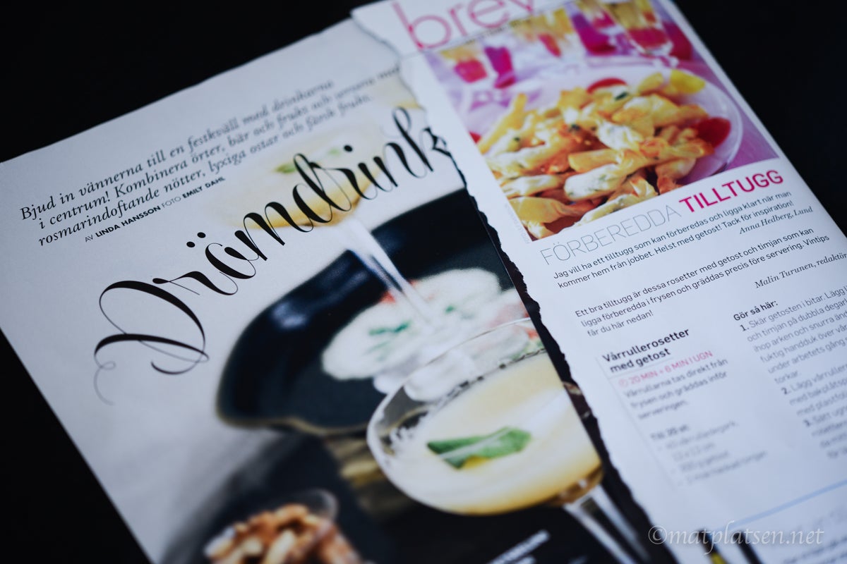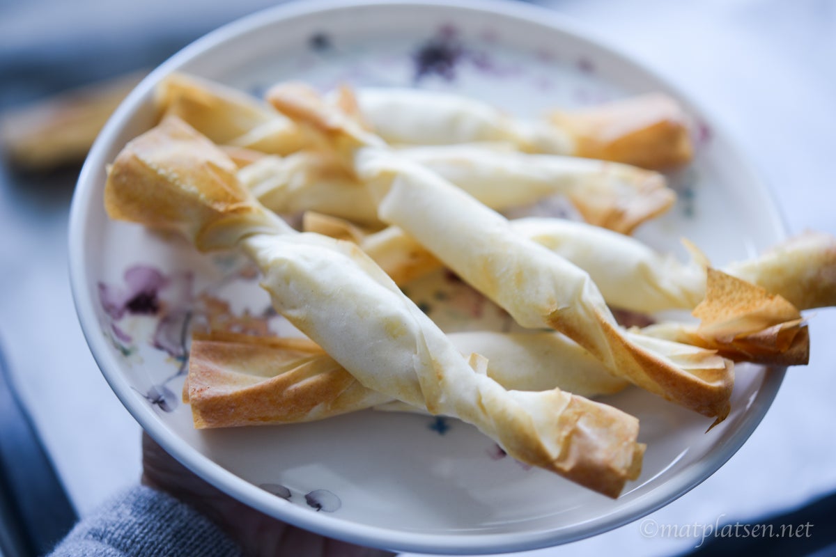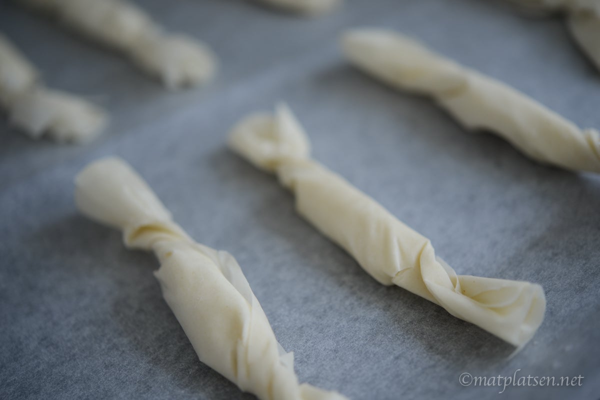 Till dessa gjorde jag lite frasiga drinktilltugg på filodeg och getost. Blivit helt tokig i getost (som jag avskydda förut!) men helst ska den vara varm.