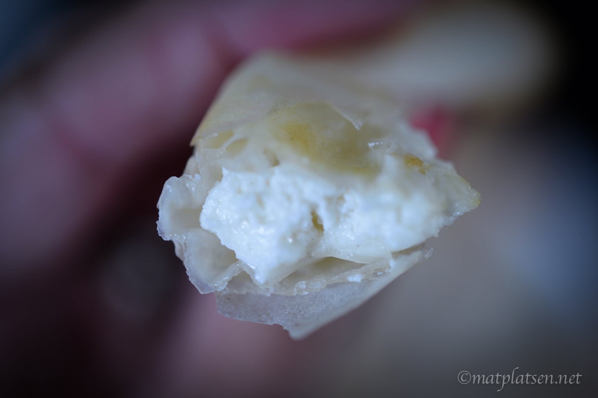 Skär getosten i bitar. Lägg lite ost på dubbla vårrulleark. Rulla ihop arken och snurra ändarna till rosetter. Ha en fuktig handduk över vårrulledegen under arbetets gång så att den inte torkar. Lägg vårrullerosetterna på en plåt med bakplåtspapper och täck tätt med plastfolie. Ställ plåten i frysen.